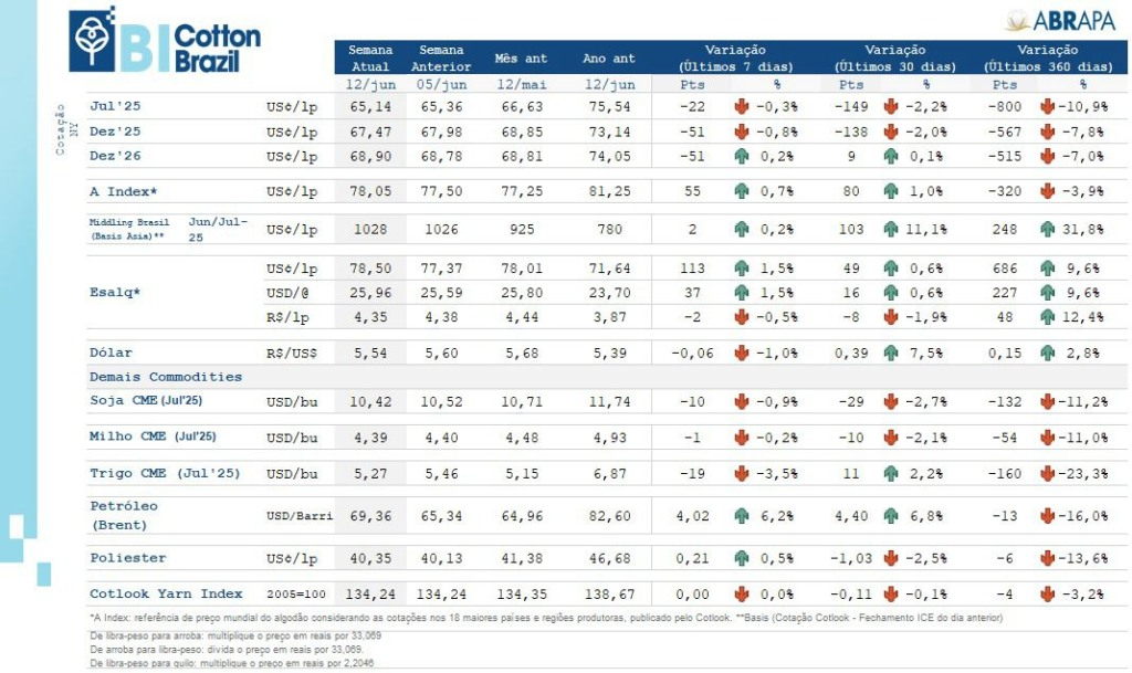 Algodão em NY – O contrato Jul/25 fechou nesta quinta 12/jun cotado a 65,14 U$c/lp (-0,3% vs. 05/jun). O contrato Dez/25 fechou em 67,47 U$c/lp (-0,8% vs. 05/jun).