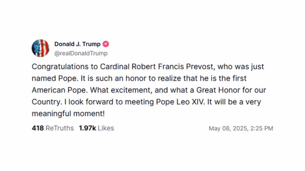 No X (antigo Twitter), Trump escreveu que era uma honra perceber que Leão XIV é o primeiro papa americano e que isso era “animador e uma Grande Honra” para os Estados Unidos. “Parabéns ao cardeal Robert Francis Prevost, que foi nomeado papa. Não vejo a hora de conhecer o papa Leão 14. Será um momento significativo”, escreveu o presidente.