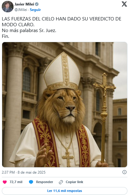 Também no X, Javier Milei, presidente da Argentina, publicou uma imagem gerada por IA, com um leão em um corpo humano. Ele escreveu: “As forças do céu deram o seu veredito de forma clara. Não há mais palavras Senhor Juiz. Fim.”