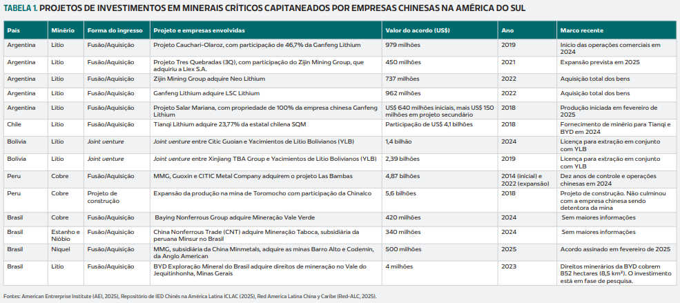 A tabela a seguir resume alguns dos investimentos em minerais críticos capitaneados por empresas chinesas na América do Sul.