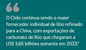 Por outro lado, o Chile continua sendo o maior fornecedor individual de lítio refinado para a China, com exportações de carbonato de lítio que chegaram a US$ 3,65 bilhões somente em 2023 – o equivalente a 67% das importações totais do produto pelo país asiático.
