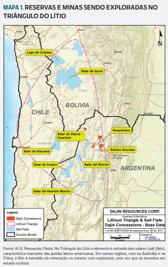 O mapa abaixo mostra a região do triângulo do lítio e algumas das reservas e minas sendo exploradas na região.