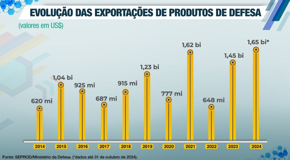 O setor de defesa alcançou um novo recorde nas autorizações de exportações de produtos e serviços. No mês de outubro, o Brasil atingiu a marca de R$ 9,53 bilhões (US$1,65 bilhão), o que representa o melhor índice nos últimos 11 anos, ultrapassando a marca anterior de US$1.62 bilhão em comercializações para o exterior registrada em 2021.