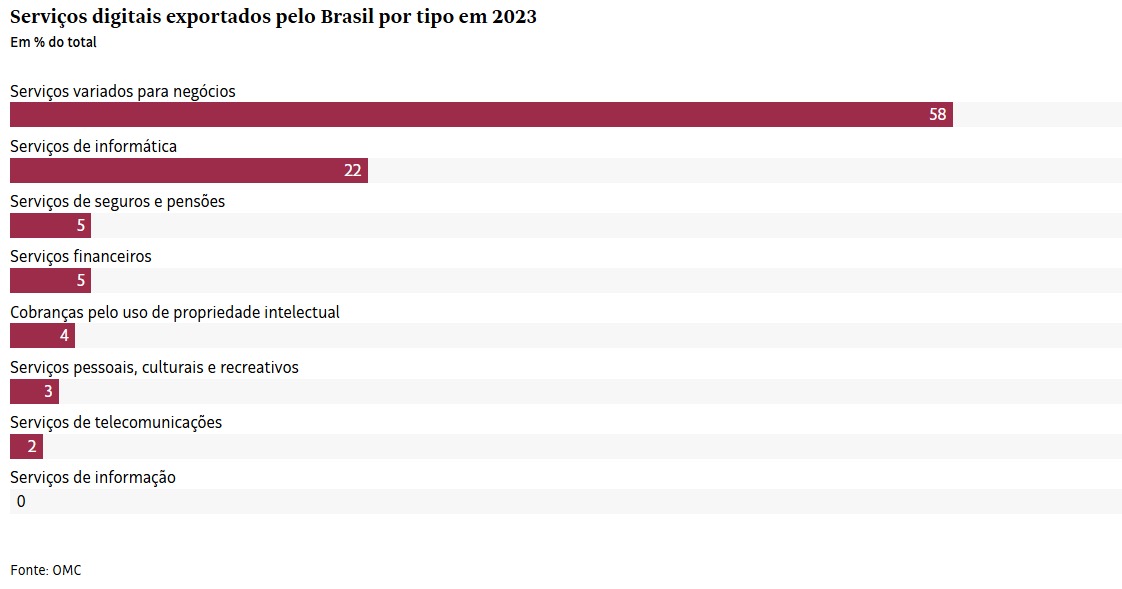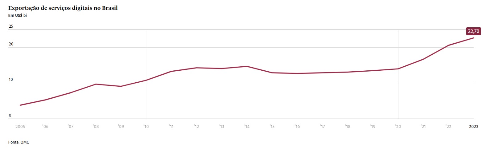 A visão pode desafiar a noção tradicional de que a exportação de um país deve se basear em produtos manufaturados, mas os números mostram que os serviços digitais são campeões de crescimento no comércio internacional hoje e que o Brasil cresce acima da média global.