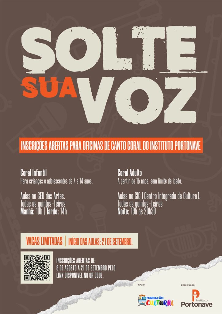 Música para transformar, unir e desenvolver talentos. O Instituto Portonave, entidade sem fins lucrativos, abre oportunidades para a primeira turma do “Coral Instituto Portonave” para comunidade, em Navegantes, nesta sexta-feira (8). Serão duas turmas de coro infantil para crianças e adolescentes de 7 a 14 anos no CEU das Artes, no bairro Nossa Senhora das Graças, com duas opções de horários, na quinta-feira, às 10h (20 alunos) ou às 14h (20 alunos), e um coral adulto para pessoas a partir de 15 anos no Centro Integrado da Cultura (CIC), no Centro, com aulas na quinta-feira, às 19h (40 alunos).