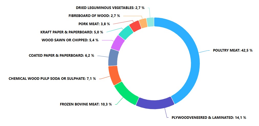 O Brasil é o maior exportador mundial de carne de frango, com destaque para o Paraná, estado líder em produção. O Porto de Paranaguá concentra o maior terminal exportador de aves congeladas do planeta, responsável por 44,1% de toda a produção nacional enviada ao exterior — mais que o dobro da participação do Porto de Santos, que registrou 20,9%. Em 2024, Paranaguá respondeu por 48% das exportações brasileiras de aves de corte.