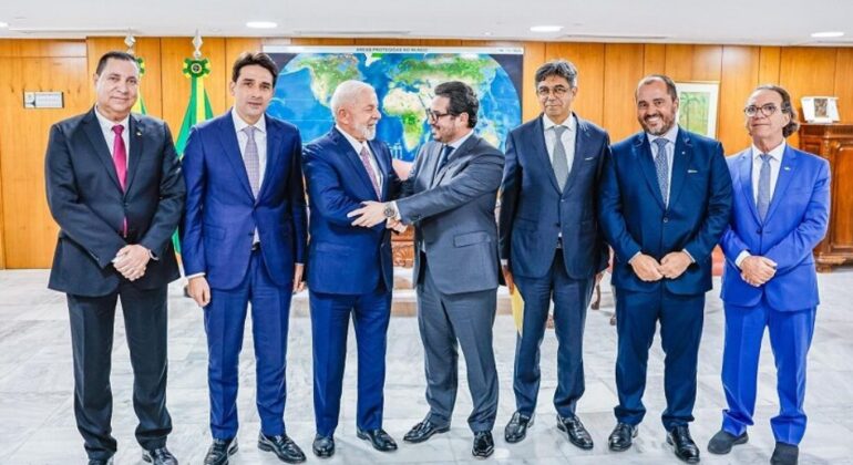 O presidente Lula e o ministro de Portos e Aeroportos, Silvio Costa Filho, receberam em Brasília o presidente do Grupo MSC, Diego Aponte; o CEO Global da TIL, Ammar Kanaan, o diretor de investimentos, Patricio Junior, e o presidente da MSC Shipping no Brasil, Elber Justo; para assinatura da prorrogação do contrato de arrendamento do Porto de Santos por mais 20 anos – uma negociação de R$ 4 bilhões.