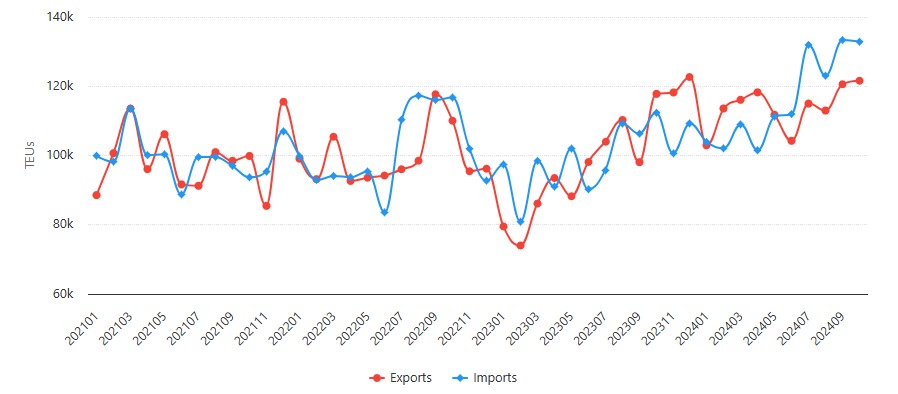 Porto de Santos | Exportações e Importações | Jan 2021 – Out 2024 | TEUs