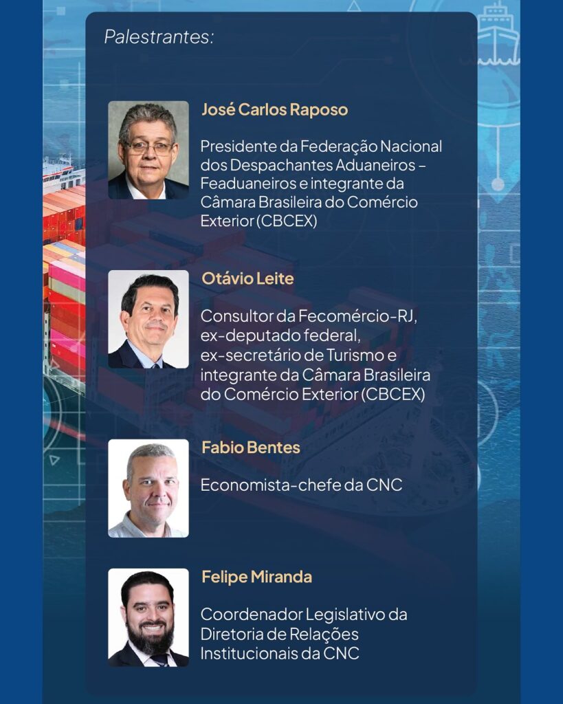José Carlos Raposo Barbosa, presidente da Federação Nacional dos Despachantes Aduaneiros (Feaduaneiros), representará no Fórum a Câmara Brasileira do Comércio Exterior (CBCEX) da CNC. Ele destaca que o momento exige alinhamento institucional e estratégia. “O comércio exterior brasileiro precisa de previsibilidade e de uma estratégia nacional sólida. As empresas estão preparadas para competir, mas precisam de um ambiente que ofereça segurança jurídica e apoio governamental para enfrentar as barreiras externas”, afirma Raposo.