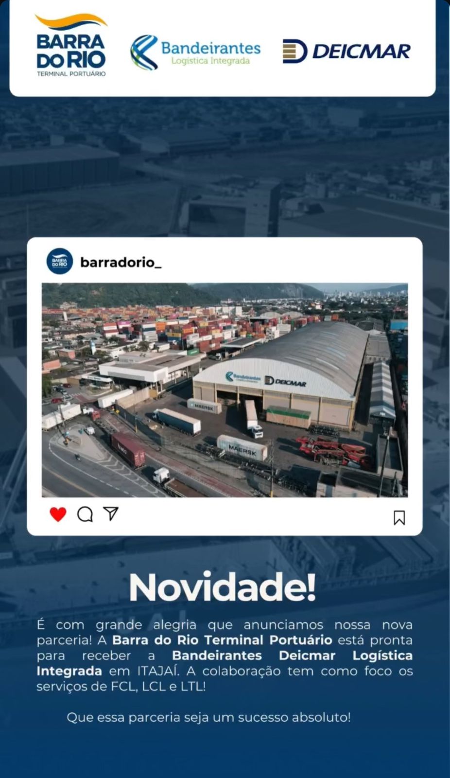 A Bandeirantes Deicmar, sendo duas empresas tradicionais do Porto de Santos e juntas se tornaram referência no setor logístico, oferecendo para seus clientes uma extensa variedade de serviços. E, esta parceria com o Terminal BARRA DO RIO (TBR), a intenção é atingir novos mercados, ampliar suas oportunidades de negócios e apresentar mais soluções aos clientes.