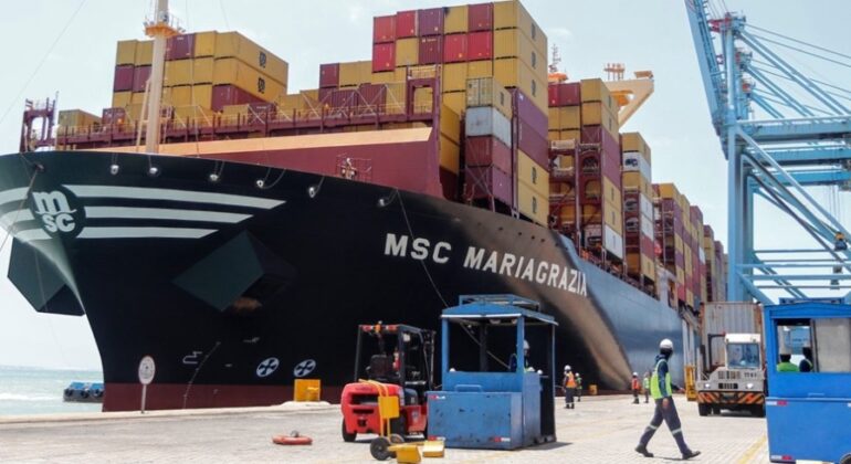 O Porto do Pecém iniciou a semana com um recorde: em 49 horas, conseguiu movimentar 7.391 TEUs (sigla para Unidade Equivalente a 20 Pés) em um único navio, o MSC Mariagrazia. Com 366 metros, o gigante veio do Porto de Caucedo, na República Dominicana, e chegou ao Pecém na última sexta-feira (27), ficando até ontem (29), quando partiu rumo ao Porto de Suape (PE).