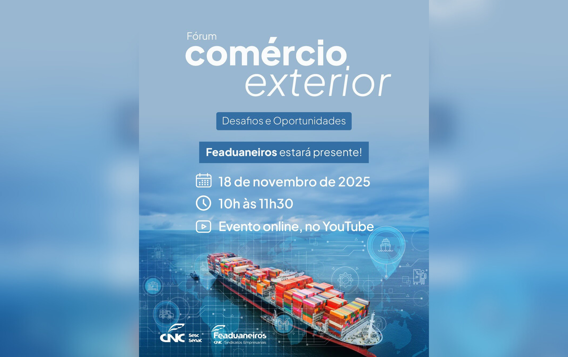 O Fórum Comércio Exterior – Desafios e Oportunidades, promovido pela Confederação Nacional do Comércio de Bens, Serviços e Turismo (CNC), será realizado em formato online, com transmissão ao vivo pelo canal CNC Play no YouTube, das 10h às 11h30. O encontro foi organizado em um momento decisivo: o aumento das barreiras comerciais ao redor do mundo e as novas sobretaxas anunciadas pelos Estados Unidos reacenderam o alerta sobre a competitividade do Brasil no mercado internacional.
