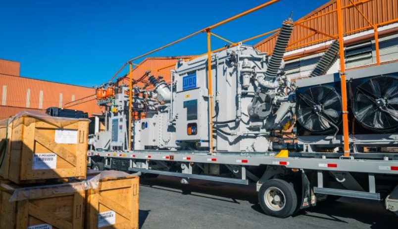 O transporte de um autotransformador trifásico da WEG começou a alterar o trânsito na região na noite de quarta-feira. O equipamento, que mede 10 metros de comprimento, 4,1 metros de largura e 5 metros de altura, pesa 210 toneladas.
