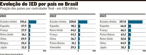 O país é o segundo com maior IED em 2024, só atrás dos EUA, e atraiu investimento estrangeiro direto global de US$ 70 bilhões, segundo dados do Banco Central.