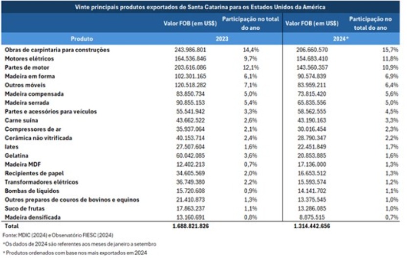 Em 2024, os Estados Unidos ganharam espaço em relação à China e assumiram a liderança isolada como destino das exportações catarinenses. De janeiro a setembro deste ano, os 20 principais produtos de Santa Catarina exportados para os EUA somaram US$ 1,314 bilhão. O ranking é liderado por obras de carpintaria para construções, com US$ 207 mihões em vendas, seguida por motores elétricos, com US$ 155 milhões, e partes de motor (US$ 144 milhões). Confira a lista completa abaixo.